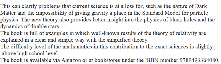of this new theory leads to an explanation of Dark Matter. It also sheds new