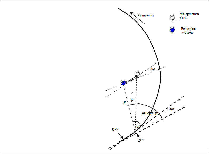 Op het moment dat het licht de zon verliet bevond de komeet zich in het punt D**. Gedurende de tijd dat de komeet zich van D** naar D* bewoog, is de  richting van de komeet enigszins veranderd door de aantrekkingskracht van de zon. Daarom moet de hoek y  worden gecorrigeerd.