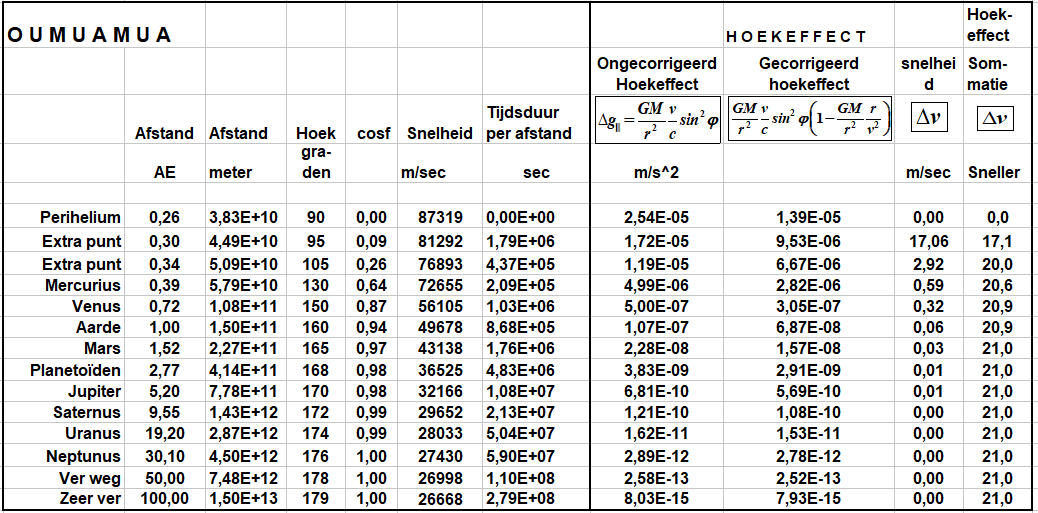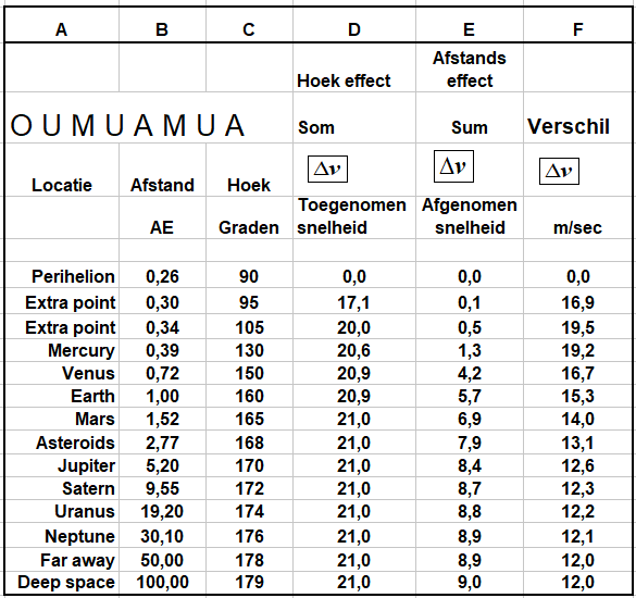 In kolom I van de tabel staat de versnelling die de komeet op de aangegeven afstand ten gevolge van het hoekeffect ondervindt. In kolom K zien we de sommatie van de snelheidstoenames over de opeenvolgende afstanden tussen de punten van kolom A. Daarmee vinden we hoeveel sneller de komeet Oumuamua gaat op verschillende afstanden nadat het perihelium  is gepasseerd als gevolg van het hoekeffect. We zien bijvoorbeeld dat de snelheid op de afstand van de baan van Venus door dit effect is toegenomen met 20,9 m/sec.