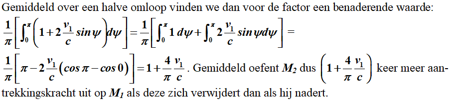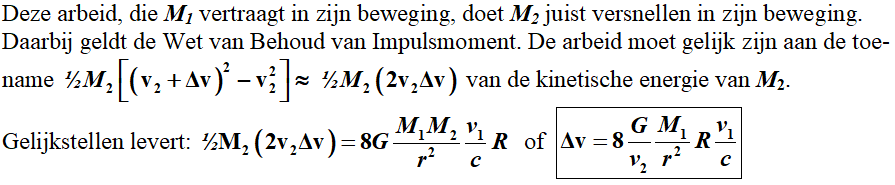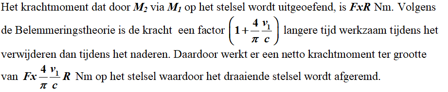 Ø           We nemen een halve omloop omdat wanneer M1 op de terugweg is de centrale massa waar hij omheen draait zelf door M2  wordt afgeremd in zijn kleine cirkel rond het draaipunt waardoor de afremmende werking die M2 op het stelsel heeft voortgaat.