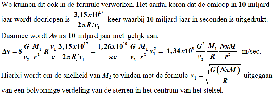 Met de aangenomen waarden v1= 50 km/sec en v2= 105 km/sec  voor R = 2000 lichtjaar respectievelijk  r = 20 000 lichtjaar vinden we: Δv= 0,89x10–9 m/sec na één omloop.