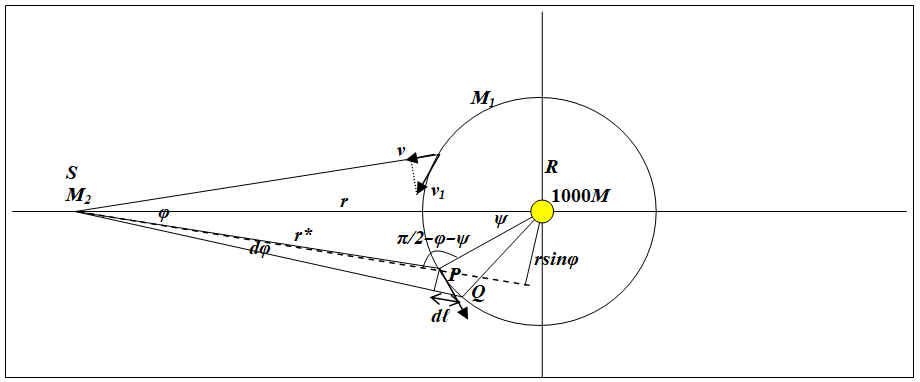 We zullen via een eenvoudige berekening laten zien hoeveel snelheid M2 zal winnen uit zijn krachtwerking met M1 als deze ten opzichte van M2 één omloop heeft volbracht rond het centrum.