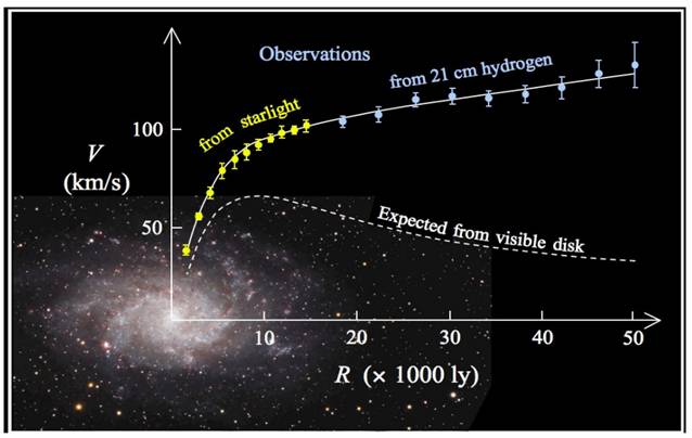Uit de formule voor de snelheid blijkt dat een hogere snelheid bij zekere straal van de baan een kwadratisch hogere massa vraagt bij een ongewijzigde verdeling van de massa. Zo zien we dat op 40 000 lichtjaar van het centrum van Messier 33 de snelheid van de sterren ongeveer 4 keer hoger is dan verwacht. Dat vraagt dus bij eenzelfde massaverdeling om een 16 keer grotere massa. Dat wordt dan aan de hypothetische Donkere Materie toegeschreven.