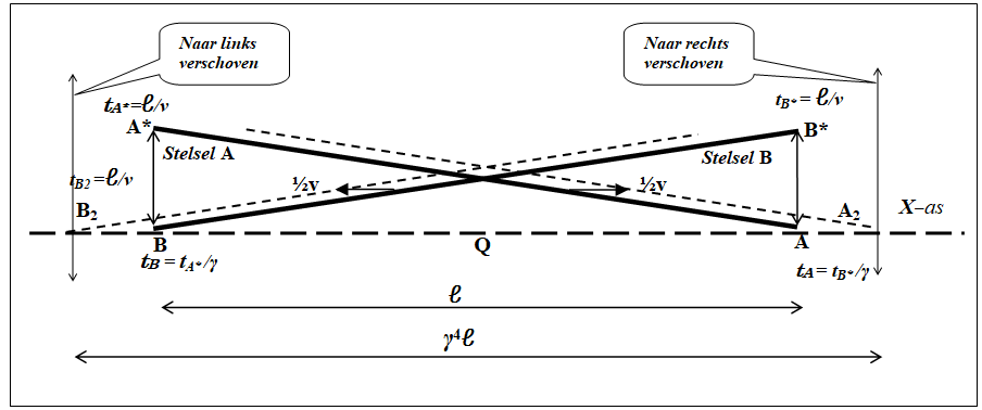 Fig 1  De streepjeslijnen  geven de plaats aan waar de stelsels zich op het tijdstip t = ℓ/v sec volgens de klokken in hun stelsel bevinden, gezien vanuit de voorpunten. Op dat tijdstip bevinden de voorpunten A2 en B2 zich γ4 meter van elkaar. De vette lijnen geven de plaats van de stelsels aan op dat tijdstip gezien vanuit de achterpunten. De onderlinge afstand van deze punten klopt wel met de traditionele opvattingen, maar we moeten bedenken dat deze punten zich op het tijdstip t=0 zelf γ4 meter van elkaar bevonden.