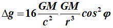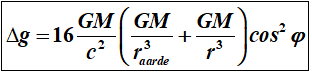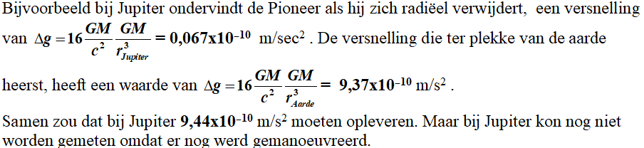 We kunnen dan de formule  m/s2 gebruiken (zie §4) bij de aarde en bij de Pioneer. Dan wordt het verschil tussen de gemeten versnelling en de traditioneel berekende versnelling gevonden met: