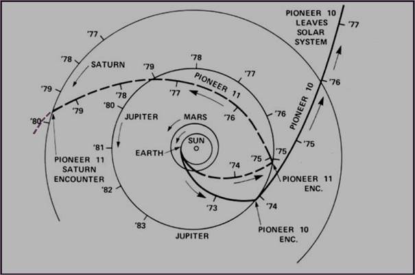 In maart 1972 werd het ruimtevaartuig Pioneer 10 gelanceerd. Ruim een jaar later april 1973 volgde Pioneer 11. Beide beschreven banen in het vlak van de ecliptica die hen langs Jupiter en andere planeten bracht en waarbij ze uiteindelijk in min of meer tegenovergestelde richtingen ons zonnestelsel verlieten .