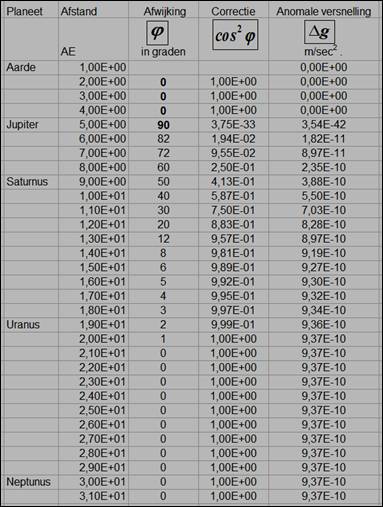 Met de gegevens van de planeten en een schatting van de hoek j en de laatste formule hebben  we de anomale versnelling delta(g) op verschillende afstanden in het zonnestelsel numeriek berekend (Tabel 1).